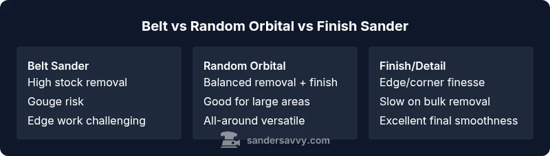 | Feature | belt sander | random orbital sander | finish sander (orbital/detail) |