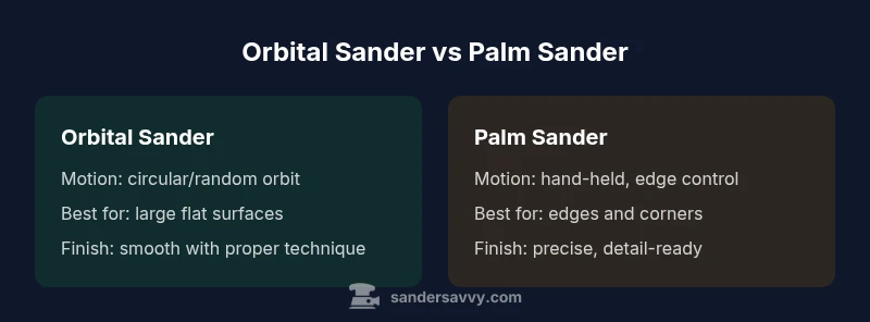 The difference between orbital sander and palm sander is not just about size; it hinges on how the tool moves, how aggressively it removes material, and where you can reach on a workpiece. An orbital sander (often marketed as a random-orbit sander) uses a round sanding pad mounted on a motor that drives a circular motion while the pad also orbits in tiny paths. This combination yields consistent surface removal with relatively smooth finishes on broad, flat areas. A palm sander, by contrast, is a compact, hand-held tool with a square or rectangular pad that delivers material removal through a back-and-forth, vibrating action. It’s easier to maneuver in corners, along edges, and over curves. Understanding the difference between orbital sander and palm sander helps homeowners pick the right tool for the job, especially when sanding floors, decks, and walls. According to SanderSavvy, the choice is driven by task size, required finish, and workspace constraints. The difference between orbital sander and palm sander becomes a practical decision once you map project needs to tool capabilities.