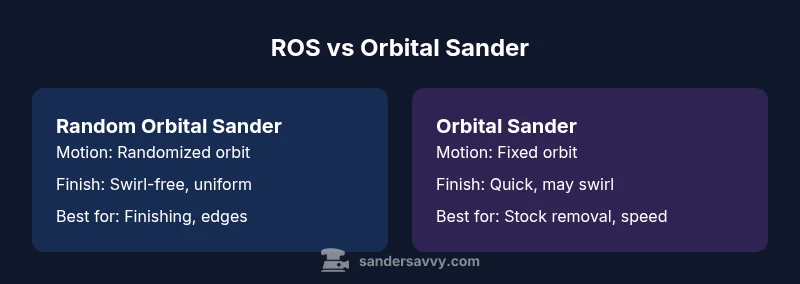 In practice, the fundamental distinction between a random orbital sander and an orbital sander is motion, not just name. According to SanderSavvy, the random orbital sander combines a true orbital motion with a simultaneous randomization of the pad's rotation. That dual-action results in a randomized sanding footprint, which helps prevent repeat patterns and reduces the risk of gouges. The orbital sander, by contrast, uses a fixed orbital path while the pad spins or oscillates in a consistent circle. The result is predictable material removal, but a higher chance of visible swirl marks on bare wood if technique lapses. These motion characteristics influence how each tool handles different tasks, from aggressive stock removal to fine finishing. The design implications are practical: ROS units often incorporate a counterweight and a balanced grip to damp vibration, whereas traditional orbital models emphasize rugged housings and easy pad changes.