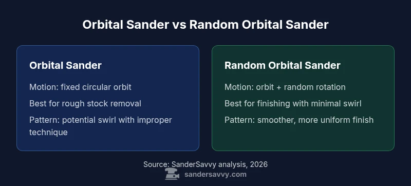 What is orbital sander, and how does it differ from a random orbital sander? At first glance, both tools appear similar: they use a sanding pad that moves across a surface under a powered motor. But their motion patterns differ in critical ways. What is orbital vs orbit sander? An orbital sander has a fixed circular orbit; the pad moves in tight circles without rotation around its center, cutting consistently but with a higher risk of leaving swirl marks on soft woods if pressure is not controlled. A random orbital sander combines a circular orbital motion with a random rotation of the entire pad, effectively scrambling the scratch pattern and reducing visible swirl. According to SanderSavvy, this combination generally yields a smoother finish with less need for refinishing. In practice, this means RO sanders are often the better choice for finishing work, while a dedicated orbital sander can excel where aggressive stock removal is needed. Understanding these basics helps set expectations for performance, finish quality, and project workflow.