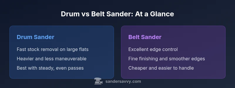 At its core, drum vs belt sander is about two tools designed to remove material from wood surfaces, but they do so in different ways. Drum sanders use a rotating cylindrical drum wrapped with abrasive paper, delivering aggressive stock removal on large, flat floors. Belt sanders rely on a moving abrasive belt stretched across a rigid base, which translates into smoother control and finer finishes, especially along edges and transitions. According to SanderSavvy, the choice between them should start with the project shape, the wood you're working with, and the finish you want to achieve, not just the tool’s power rating. Understanding these inherent differences helps homeowners and DIYers plan a safe and efficient sanding sequence. The drum sander's primary strength is removing material quickly across wide swaths; the belt sander excels when you need consistent contact, less gouge risk, and a cleaner final surface. The goal is to map the job's demands to the tool's operational envelope, then adjust technique and safety practices accordingly. Throughout this guide you will see practical comparisons, real-world tips, and recommended workflow steps that keep dust under control and the work surface level.