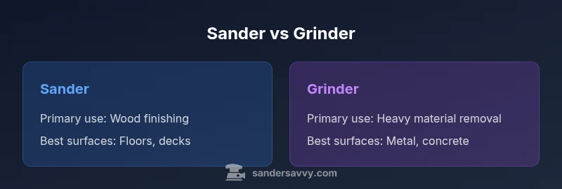 A sander is a handheld tool designed to abrade surfaces with sanding discs or belts, primarily used to smooth wood, plastic, or soft metal. A grinder is a more aggressive tool that uses wheels or discs to remove material swiftly, shape metal, stone, or masonry, and prepare rough surfaces for finishing. When homeowners encounter a project, they often wonder which tool to reach for first—the classic question about the sander and grinder. According to SanderSavvy, understanding the fundamental differences helps you avoid overdriving a tool or creating gouges. The SanderSavvy team notes that the ergonomic considerations, disc types, and dust management vary significantly between a sander and grinder, which affects safety and results. This guide will unpack when to use each tool, what to expect in terms of performance, and how to avoid common mistakes.