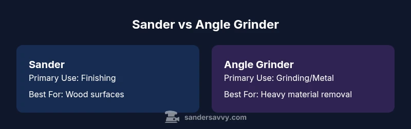 A sander is designed for smoothing and finishing wood or soft surfaces, using pads or discs to remove minimal material with control. An angle grinder uses a spinning abrasive wheel to aggressively remove material, grind, or cut hard materials like metal and masonry. The key distinction is finish quality versus removal speed.
