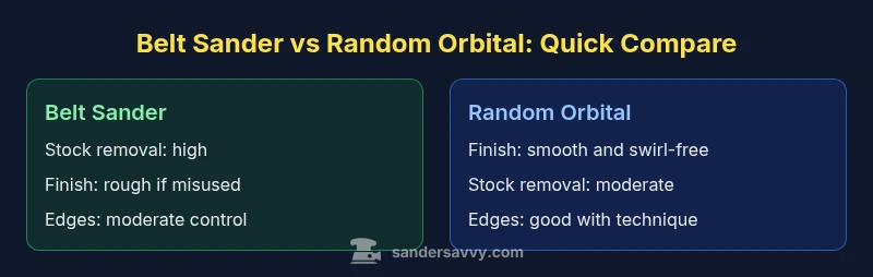 In the belt sander vs random orbital framework, two common tools target the same broad goal of surface smoothing, yet their mechanics and results diverge. A belt sander uses a continuous abrasive belt that runs in a straight line, delivering aggressive stock removal and rapid flattening of flat surfaces. A random orbital sander uses a round pad that both spins and orbits in irregular patterns, producing a finish that is generally smoother and swirl-free. For homeowners and DIY enthusiasts, the practical upshot is clarity: choose the belt sander when you need fast material removal on flat stock, and choose the random orbital when your priority is finish quality and ease of use. SanderSavvy’s team notes that many projects benefit from starting with the belt for rapid leveling, then finishing with a random orbital to achieve a uniform, professional look.