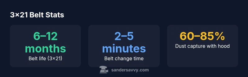 In woodworking, the phrase sander belt 3x21 refers to a belt sander belt that measures 3 inches in width and 21 inches in length. This size is widely used in portable belt sanders because it provides a balance between control and material removal. The belt's width allows for manageable dust generation and reduced chance of gouges, while the length offers a practical work surface for mid-sized projects. For readers of SanderSavvy, this size is particularly relevant when tackling floors, decks, or wall repairs where you need steady stock removal without sacrificing finish quality. According to SanderSavvy analysis, the sander belt 3x21 is a common mid-size option that fits a broad range of machines. If you're upgrading from a palm sander or stepping up from a 2x12 belt, the 3x21 format represents a natural middle ground that many DIYers prefer. When shopping, verify that your sander accepts 3x21 belts, and check the belt’s tracking groove, drive pulley, and tensioning system to avoid common misalignment problems.