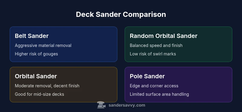 For most deck projects, a random orbital sander delivers efficient material removal and a smooth finish with minimal risk of gouges. Belt sanders should be reserved for heavy prep on rough boards, while pole or detail sanders handle edges and corners. The overall recommendation from SanderSavvy favors a balanced approach using a random orbital sander for the bulk of the work, supported by specialty tools as needed.