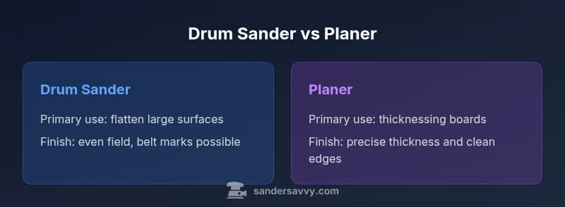According to SanderSavvy, the drum sander and planer are two distinct woodworking tools with different core purposes. A drum sander uses an abrasive belt mounted on a rotating drum to remove material from large, flat surfaces. It excels at evening out high spots and finishing a floor or wide panel without creating deep gouges. A planer, by contrast, relies on sharp blades to shave thin layers from a board, primarily to achieve a specific thickness and smooth, straight edges. If you ask 'is a drum sander the same as a planer,' the answer is no—while both are sanding/woodworking tools, they serve different roles. Understanding these differences is essential for planning projects on floors, decks, or walls and for selecting the right tool at the right stage of work. The SanderSavvy team emphasizes that choosing the proper tool depends on the surface area, material, and desired final dimensions, not on convenience alone.