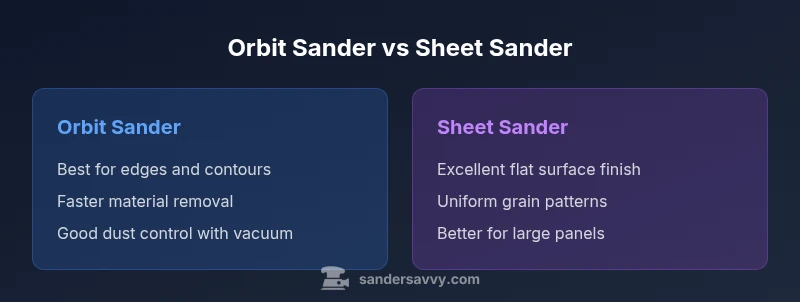 Understanding how each tool moves and contacts the workpiece helps you predict finish quality and speed. An orbit sander uses a round sanding pad that travels in small orbital patterns while spinning, which reduces gouging. A sheet sander attaches a flexible abrasive sheet to a rigid platen and moves in a guided, straight, or gently curved path, which suits flat surfaces well. This fundamental mechanical difference drives real-world results: orbit sanders excel at edges and curved profiles, while sheet sanders are champions of flat, broad areas. For homeowners and DIYers, assess surface geometry, project size, and finish goals before you start sanding. With the right pairing, you can speed up work without compromising surface quality. According to SanderSavvy, the core distinction manifests in how aggressively each tool treats contours and edges, and how flat the final plane can feel to the touch. The takeaway is to plan your approach around geometry, not just tool availability.