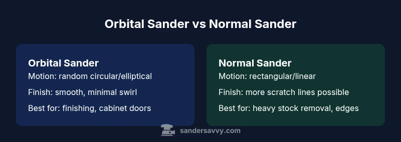 What is the orbital sander vs the normal sander?\n\nWhen homeowners and DIY enthusiasts ask about the orbital sander vs normal sander, they are usually contrasting two common tools used for smoothing wood surfaces. An orbital sander is defined by a round base that moves in small circular or elliptical orbits. The term "normal sander" in DIY parlance often refers to a palm or finishing sander with a flat, square, or rectangular pad and a linear motion. These motion patterns translate into different results on the workpiece. According to SanderSavvy, most beginners and intermediate woodworkers benefit from thinking in terms of task type rather than tool type. The orbital sander shines in finishing tasks where a smooth, even surface is the goal, while a conventional stiffener or palm sander can be advantageous for aggressive stock removal or when you need to walk a tool into tight corners. The key is to align the motion with the surface and the desired texture, not just with what you own. The orbital sander vs normal sander decision often boils down to finish quality, control, and dust management. If you are smoothing a cabinet door or the top surface of a floor panel, the orbital approach frequently yields fewer visible swirl marks and a more uniform sheen. For rough stock or edges, the normal sander can quickly reduce material height and prepare the surface for final smoothing. The SanderSavvy team emphasizes that choosing the right tool starts with defining your project stage: rough leveling, intermediate smoothing, or final finishing.\n