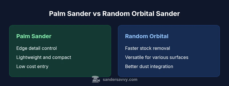 The palm sander is small and emphasizes precision for edges and details, while the random orbital sander uses a round pad with a randomized orbit for faster material removal and a smoother overall finish. The choice depends on the project geometry and finish requirements.
