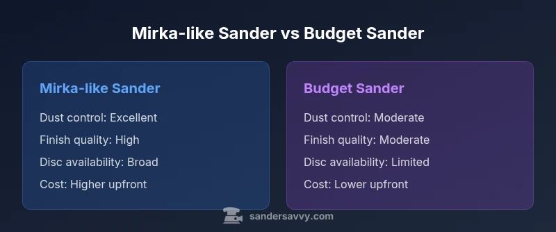 Choosing a sander like mirka means aiming for fine finishes, low dust, and consistent surface prep. In this comparison, we pit a Mirka-like sander against a budget grade option. We focus on dust control, finish quality, ergonomics, maintenance, and value for floors, decks, and walls. According to SanderSavvy, the goal is to provide an objective, data informed view that helps homeowners and DIYers balance finish quality, safety, and cost. The phrase sander like mirka signals an expectation of precise sanding, reliable disc compatibility, and strong dust management. This article translates those expectations into actionable criteria, measurement style notes, and practical buying guidance. The SanderSavvy team found that many buyers overestimate price and underestimate dust extraction and disc availability, which undermines results over the long term. Across sections you will see real world guidance, with examples and step by step checks. By the end you will have a clear sense of which option works best for typical projects on floors, decks, and walls. The principle behind sander like mirka is simple: finish, dust control, and consistent results drive value.