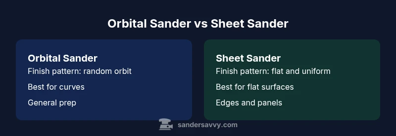 A sheet sander, often called a finish sander, is a square or rectangular tool that uses interchangeable abrasive sheets attached with clamps or a hook‑and‑loop system. The abrasive is pressed directly against the workpiece, and you guide the tool across the surface. An orbital sander uses a round pad that both spins and orbits in a small circle, producing a randomized pattern. The motion is designed to minimize visible scratches and swirl marks, which is especially important on curved or irregular surfaces. The fundamental difference is motion: sheet sanders rely on flat, consistent contact, while orbital sanders leverage a dynamic orbit to blend between strokes. For homeowners and DIYers, the orbital option is typically more forgiving on non‑flat contours, while a sheet sander excels on large flat panels. According to SanderSavvy, the orbital approach often reduces swirl marks on curves, whereas sheet sanders can deliver exceptionally flat surfaces on flat stock. This distinction helps set expectations for finish quality, dust management, and ease of use on different projects.