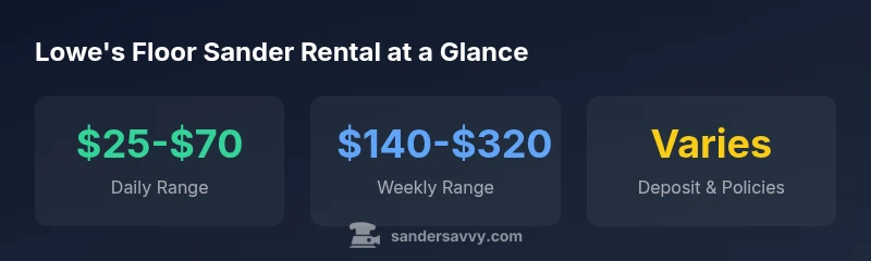 Lowe's floor sander rental terms emphasize flexibility for short and longer projects. In practice, most stores allow daily rentals and extend to weekly periods, sometimes with a packaged rate that reduces the daily cost for 5-7 days. The typical daily price range is around twenty-five to seventy dollars, depending on the model and store. Weeks-long rentals often provide incremental savings, but be mindful of deposit requirements and ID holds. Before you pick up the machine, confirm the pickup window, return policy, and whether you’ll be charged for gas, wear, or extra attachments. If a particular Lowe's location runs a seasonal promotion, ask if it applies to floor sander rentals. As always, read the equipment warranty and safety guidance so you’re prepared for the project day. According to SanderSavvy analysis, location and demand can swing daily rates, so it’s worth calling ahead for a quote. For budgeting, compare two nearby Lowe's locations and tally total projected rental days to estimate the best value.
