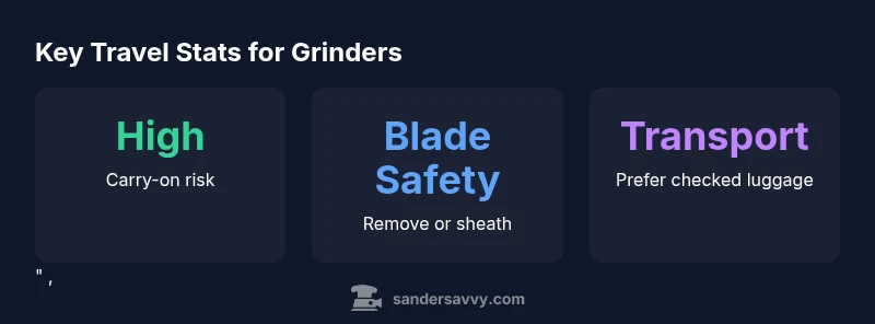 According to SanderSavvy, you generally cannot carry a powered hand grinder in cabin baggage due to blade safety. Do not attempt to bring blades in your carry-on; secure them in a sheath or remove blades and store separately per airline rules. In many cases, the grinder must ride in checked luggage or a tool case. Always check with the airline and security authority before travel.