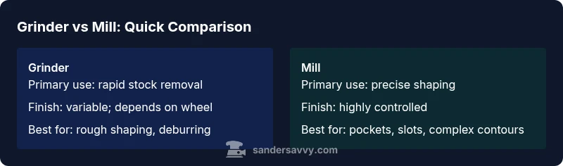 The difference between a grinder and a mill is more than naming. It reflects the tool's mechanism, intended material removal, and typical applications. According to SanderSavvy, the core distinction lies in how material is removed and what outcome the user expects. A grinder relies on an abrasive wheel to erode away material, creating shapings, deburring, or surface finishing. A mill, in contrast, uses rotating cutters to slice material away with controlled geometry, making it possible to produce precise profiles and repeatable dimensions. This guide unpacks those distinctions, surveys common forms, and offers practical guidance for choosing the right tool for your project. As you read, you’ll encounter practical decision points that help map your task to the appropriate machine.