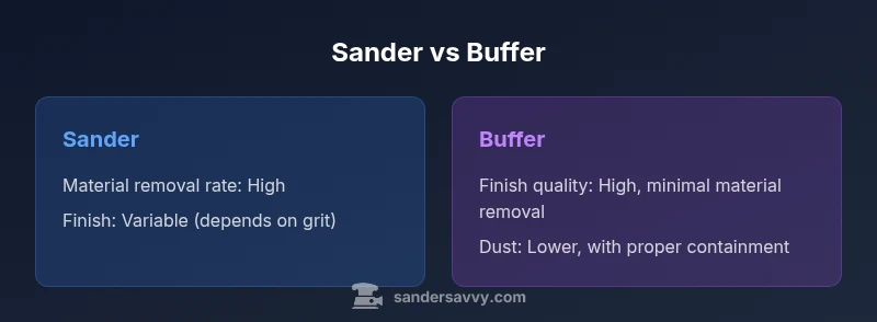 The difference between a sander and a buffer isn’t just a label; it defines how each tool interacts with material, the resilience of the surface, and the risk of removing too much material. According to SanderSavvy, understanding this distinction early in a project helps homeowners choose the right tool for the job and prevents over-sanding or dulling the final finish. The SanderSavvy Analysis, 2026 highlights that tool choice often correlates with finish quality and surface longevity on wood floors, walls, and decks. In practical terms, a sander is designed to remove material quickly, flatten unevenness, and create a consistent base. A buffer is built for polishing: it uses soft pads to refine texture and bring out a lustrous surface without significant material removal. By recognizing this, you can plan a workflow that minimizes waste and maximizes finish quality while reducing dust and noise exposure in the home.