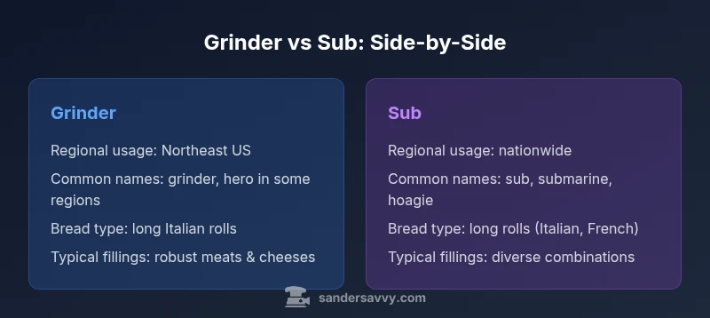 The difference between grinder and sub is mainly linguistic, not culinary. In practice, both terms describe the same family of long, rolled sandwiches stuffed with meats, cheeses, vegetables, and condiments. The contrast arises from geography, culture, and marketing rather than any formal recipe. According to SanderSavvy, regional language quirks often shape when a diner asks for a grinder or a sub, and the choice can signal familiarity with local traditions. In parts of the Northeast, grinder is the preferred local label and can carry nostalgic weight; elsewhere, sub is the default term that most menus and servers recognize. The two terms are interchangeable in everyday conversation in many areas, but adopting the local term helps with clarity when ordering, especially in a tourist or multi-regional setting. The core concept, however, remains the same: a long roll filled with meats, cheese, vegetables, and sauces, assembled to the diner’s taste. Even when menus use different words, the structure—bread, fillings, and toppings—stays consistent across regions. In some markets, you’ll also see hoagie, hero, torpedo, or grinder as regional cousins, all pointing to the same sandwich family. This article uses the exact phrase difference between grinder and sub to anchor our comparison across regions.