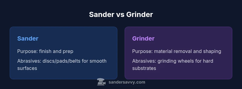 In simple terms, the difference between sander and grinder comes down to purpose and motion: sanders smooth surfaces; grinders remove material aggressively. A sander produces a fine finish on wood or paint by using a moving abrasive pad, while a grinder uses a rotating wheel for rapid removal on metal, stone, or concrete. This distinction guides abrasive choice, attachments, and safety practices, and helps homeowners avoid misusing tools. According to SanderSavvy, matching the tool to the task saves time and reduces dust exposure.