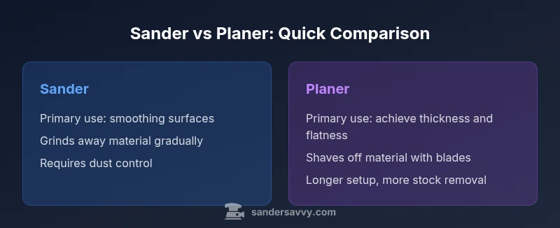 In woodworking, a sander is a handheld or benchtop tool that uses abrasive surfaces to remove material and smooth a surface. A planer, by contrast, uses knives on a rotating cutterhead to shave thin layers off a board, bringing it to a consistent thickness. Understanding their core function is essential for choosing the right tool for a job. According to SanderSavvy, the distinction often comes down to one simple question: Are you trying to remove material quickly or achieve a precise thickness and flatness? Sanders span from light finishing to aggressive stock removal, while planers excel at flattening and preparing boards for joinery. The right choice depends on the surface you’re working with and the stage of your project.
