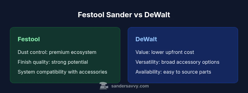 In the world of sanding tools, the question festool sander vs dewalt arises frequently for homeowners and DIYers aiming to finish floors, decks, or walls with consistent results. The decision isn’t only about price; it hinges on how dust control, finish quality, system integration, and long-term ownership play into your workflow. The SanderSavvy team has examined practical usage in workshops and garages to help you separate marketing claims from real-world performance. If you’re choosing between Festool and DeWalt, start by listing your project types, the importance of dust containment, and how much time you can devote to maintenance. The goal is to identify which brand aligns with your project mix, your tolerance for maintenance, and your budget realities. Throughout this guide, we reference the festool sander vs dewalt comparison as a running thread to keep the discussion grounded in everyday use, not just in spec sheets.