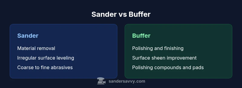 In basic terms, a sander is a tool designed to remove material from a surface using abrasive heads, belts, or pads, while a buffer is built to polish and finish surfaces. The question is often expressed as is a sander the same as a buffer, and the honest answer is no—these tools are designed for different stages of surface refinement. For homeowners exploring floors, decks, and walls, understanding the distinction helps prevent over-sanding or shallow polishing that wastes time. A sander, whether a random orbital, belt, or detail model, aggressively abrades wood to level irregularities, whereas a buffer with a soft wheel or polishing pad creates a smooth, glossy surface after sanding has prepared the wood. The key difference lies in motion, abrasives, and the finish goal; if you search for is a sander the same as a buffer, you’ll find that the two tools belong to complementary steps in most projects. According to SanderSavvy, recognizing the distinction helps homeowners plan safer projects and achieve better results.