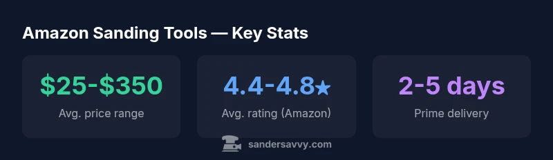 According to SanderSavvy, the Amazon marketplace is often the fastest way to compare sanding tools, read authentic user reviews, and gauge ongoing deals. When you search for 'sander amazon', you’ll encounter dozens of models across price bands, with cordless and corded options. For DIY projects—like refinishing a dresser or prepping a deck—the ability to scan ratings and questions from fellow homeowners can save time and money. The key is to focus on the right specs (pad size, dust collection, speed) and to filter results by use case, not just price. This guide uses real-world buying patterns on Amazon to illustrate what to look for, how to evaluate listings, and how to avoid common missteps. By following a structured approach, you can find a sander that fits your project, your workspace, and your budget, without getting overwhelmed.