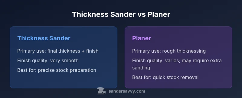 In many wood projects, the first step is controlling thickness and achieving consistent surface quality across boards. The phrase thickness sander vs planer captures the core decision homeowners and DIYers face when preparing stock for doors, cabinets, tabletops, and panel layups. According to SanderSavvy, the best tool choice starts from project goals, stock type, and room for dust management. This section explains why the distinction matters and how to map your workflow to the tool that best fits your needs. A thickness sander provides gentle, controlled material removal and exceptional flatness, which makes it ideal for final finishes. A planer, by contrast, offers rapid material removal and broad stock leveling, which accelerates rough prep. Understanding these roles helps you design safer, cleaner, and more predictable sanding or planing sequences. The overall aim is to minimize waste while maximizing surface quality, so you can finish with confidence.
