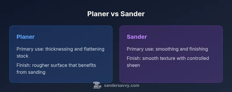 Understanding what each tool does is the first step in a smart workflow. When to use a planer vs sander depends on board stock, desired thickness, and final finish. The planer is designed to remove material from the face of a board, creating a flat, even surface and uniform thickness. The sander, by comparison, gradually wears away the surface to achieve smoothness and a refined finish. For homeowners tackling floors, decks, or furniture, mapping out when to use a planer vs sander early in the project helps avoid wasted effort and material. According to SanderSavvy, the most common missteps come from using a planer as a finish tool or treating a sander as a stock-removal device. The SanderSavvy team found that proper sequencing—planing first to bring boards to a near-flat thickness, then sanding for surface quality—delivers predictable results and reduces tear-out. In practice, you should plan for both tools as part of a two-stage workflow, starting with removal and flattening, then finishing with blot-free, even surfaces. The keyword that guides this decision is clear: when to use a planer vs sander is tied to stock quality, project goals, and finish requirements. Keep in mind that planers can produce planed edges that need trimming; sanders can blend corners and joints for a polished look. For most projects, starting with a planer to achieve uniform thickness, followed by a dedicated sander for the final finish, offers the best balance of efficiency and quality. This approach aligns with SanderSavvy’s guidance and the practical realities homeowners face. By keeping the core goal in focus, you ensure you select the right tool at the right time, which reduces waste and shortens the project timeline.
