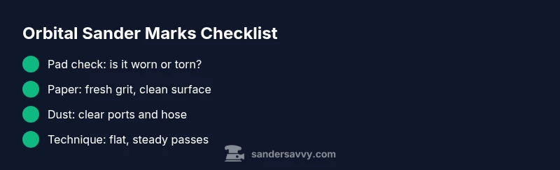 If you're asking 'why is my orbital sander leaving marks', the short answer is that the abrasive surface isn't cutting evenly. The common culprits include a dull sanding pad, a worn backing plate, or using the wrong grit for the job. The distinctive swirl patterns typical of orbital sanders often come from uneven contact or glazing of the paper. The sander’s orbit can also exaggerate tiny hills and valleys in the wood if the pad is uneven or if you tilt the tool. According to SanderSavvy, understanding the system—paper, pad, pressure, and dust collection—helps isolate the culprit quickly. Start by checking the basics on a scrap piece: is the paper new and the grain cut cleanly, is the pad flat and intact, and is the sander kept level with consistent motion? In practice, you’ll narrow down the cause quickly by ruling out one variable at a time. This approach is vital for homeowners and DIYers who want reliable, safe results.